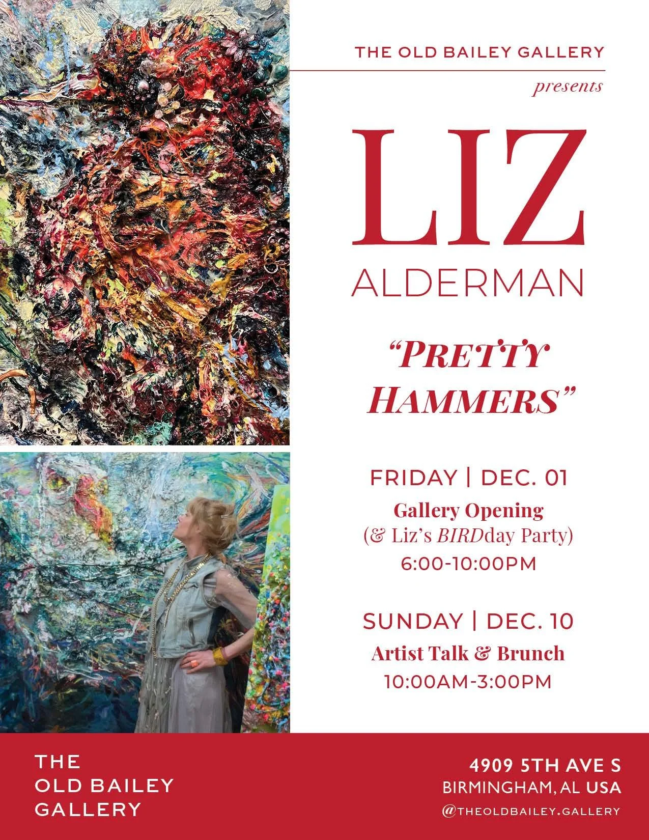 Birds are the visual subject matter of choice for artist Liz Alderman. Their shapes, colors and expressivity are the perfect fodder for the artist to exult in the materiality of paint. For “PRETTY HAMMERS” Liz has taken inspiration from native bird species of Alabama to produce an entirely new set of paintings dedicated to the Yellowhammer Stat